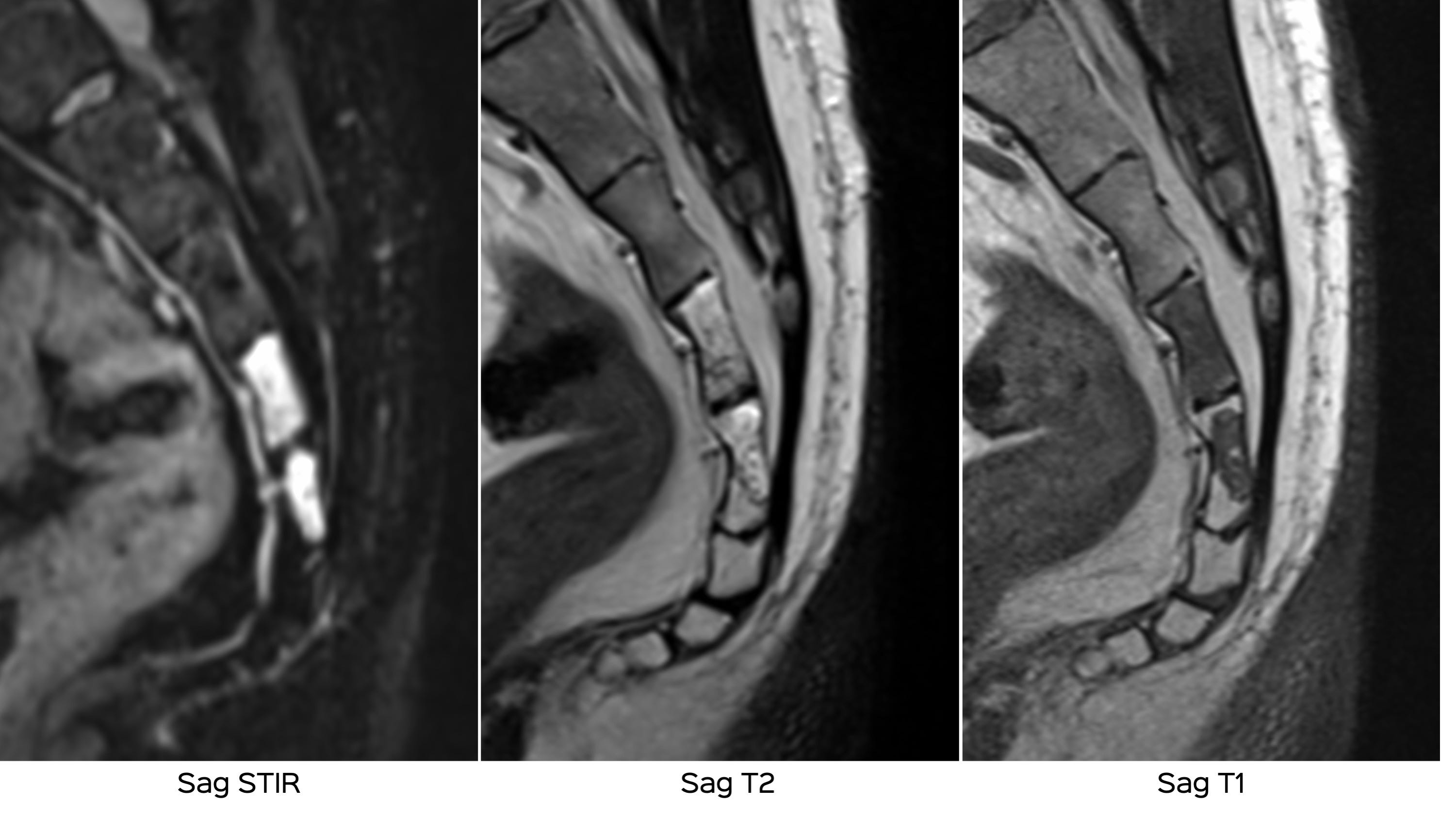 This 51-years old presented with erratic coccygeal pain. The MRI showed these findings.
