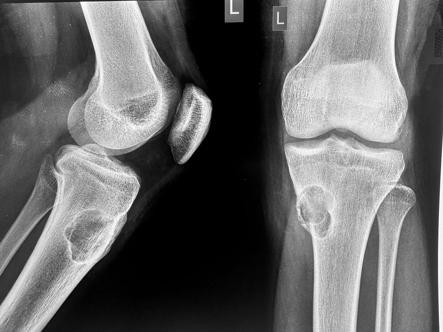 X-ray shows an osteolytic lesion with a sclerotic rim - this is a benign lesion.