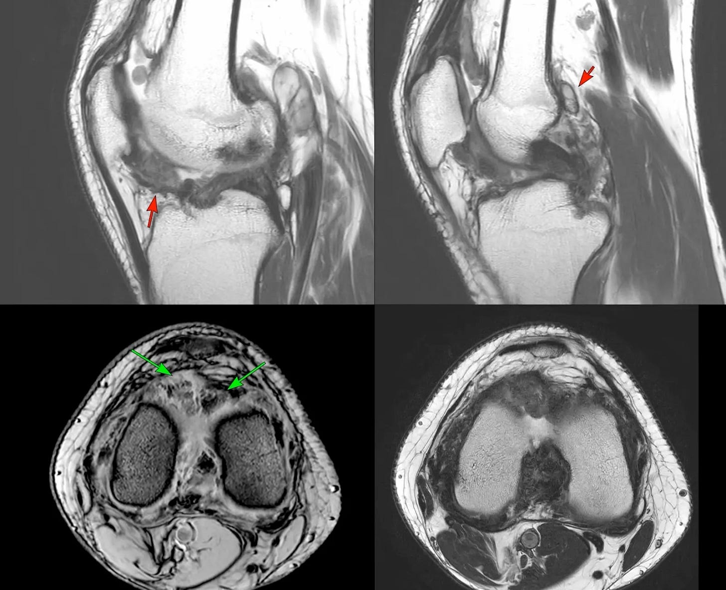 23-years old known to have tenosynovial giant cell tumor - the gradient image (lower left image) shows blooming of hemosiderin (green arrows).