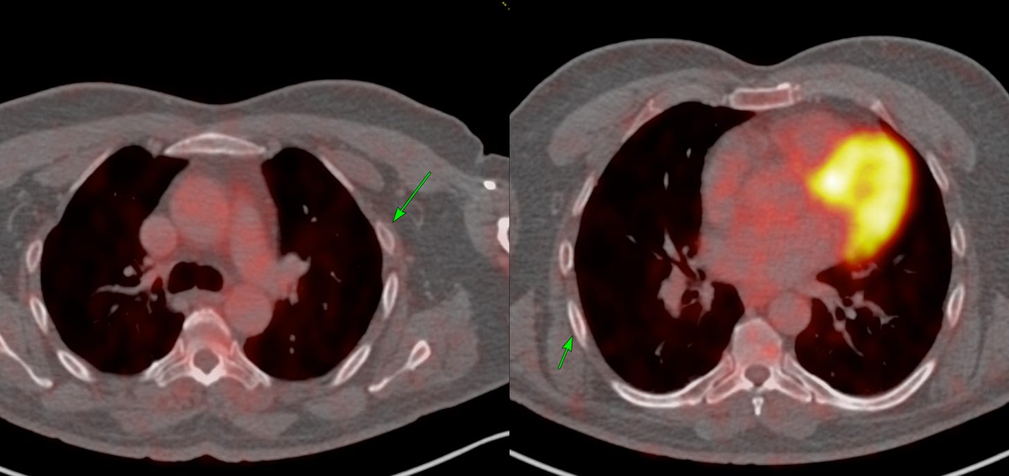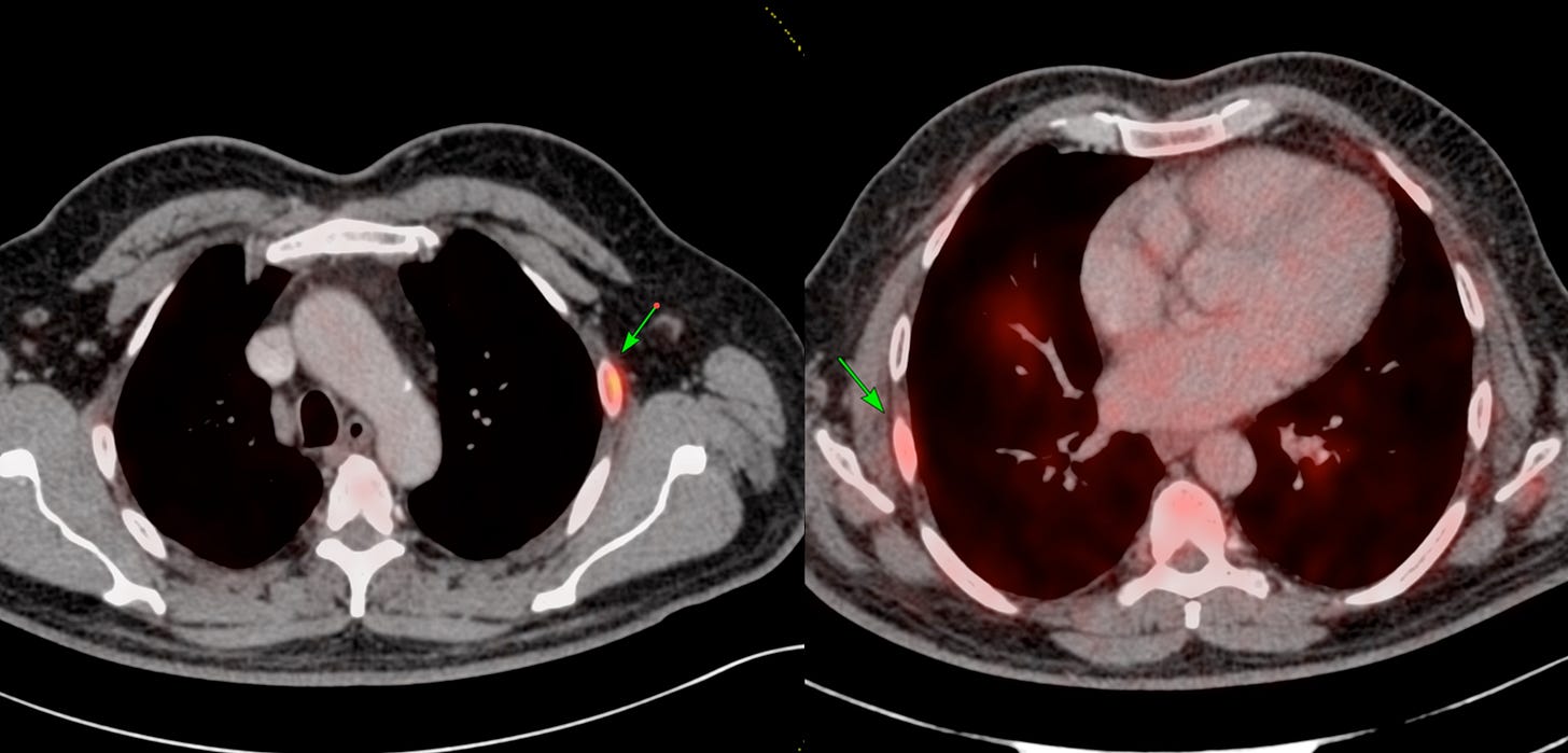 63-years old with Ca prostate had uptake on PSMA in the left 3rd rib anteriorly and right 6th rib posteriorly. The CT does not show any lesion there (Fig. 1).